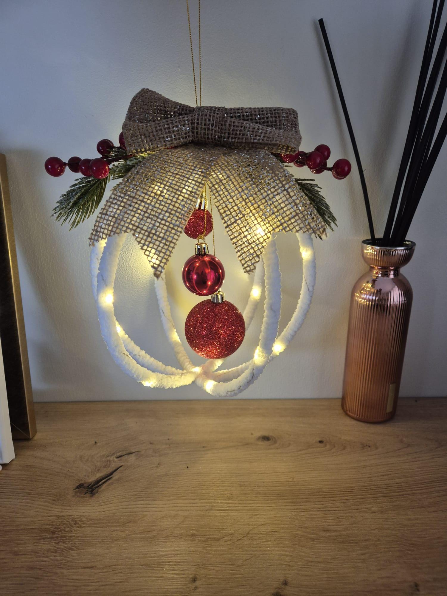 Large Handmade Christmas Hanging Decoration, expertly crafted to transform any space into a festive sanctuary. This unique artisanal piece combines traditional craftsmanship with contemporary design, delivering both visual impact and atmospheric warmth to your home during the holiday season. Measuring approximately 22 cm in diameter, this substantial decoration commands attention whilst remaining versatile enough to complement various interior styles. The integrated battery-powered LED lighting system provides an enchanting nocturnal glow, extending the decorative appeal throughout evening hours without requiring permanent electrical installation. Each piece is individually handmade, ensuring no two decorations are identical. This bespoke quality makes it an exceptional choice for those seeking distinctive seasonal décor that transcends mass-produced alternatives. The thoughtful engineering of the LED system ensures reliable performance throughout the festive period, whilst the durable construction promises longevity across multiple seasons. Ideal for creating focal points in living spaces, entryways, or bedrooms, this decoration bridges the gap between functional lighting and artistic expression, elevating your Christmas ambiance with understated elegance.
