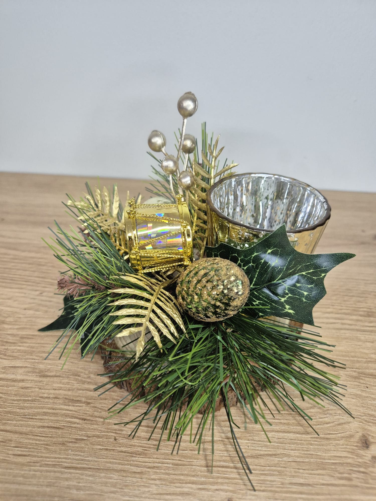 Handmade Christmas tealight holder featuring a distinctive wood base, meticulously crafted to elevate your festive décor.