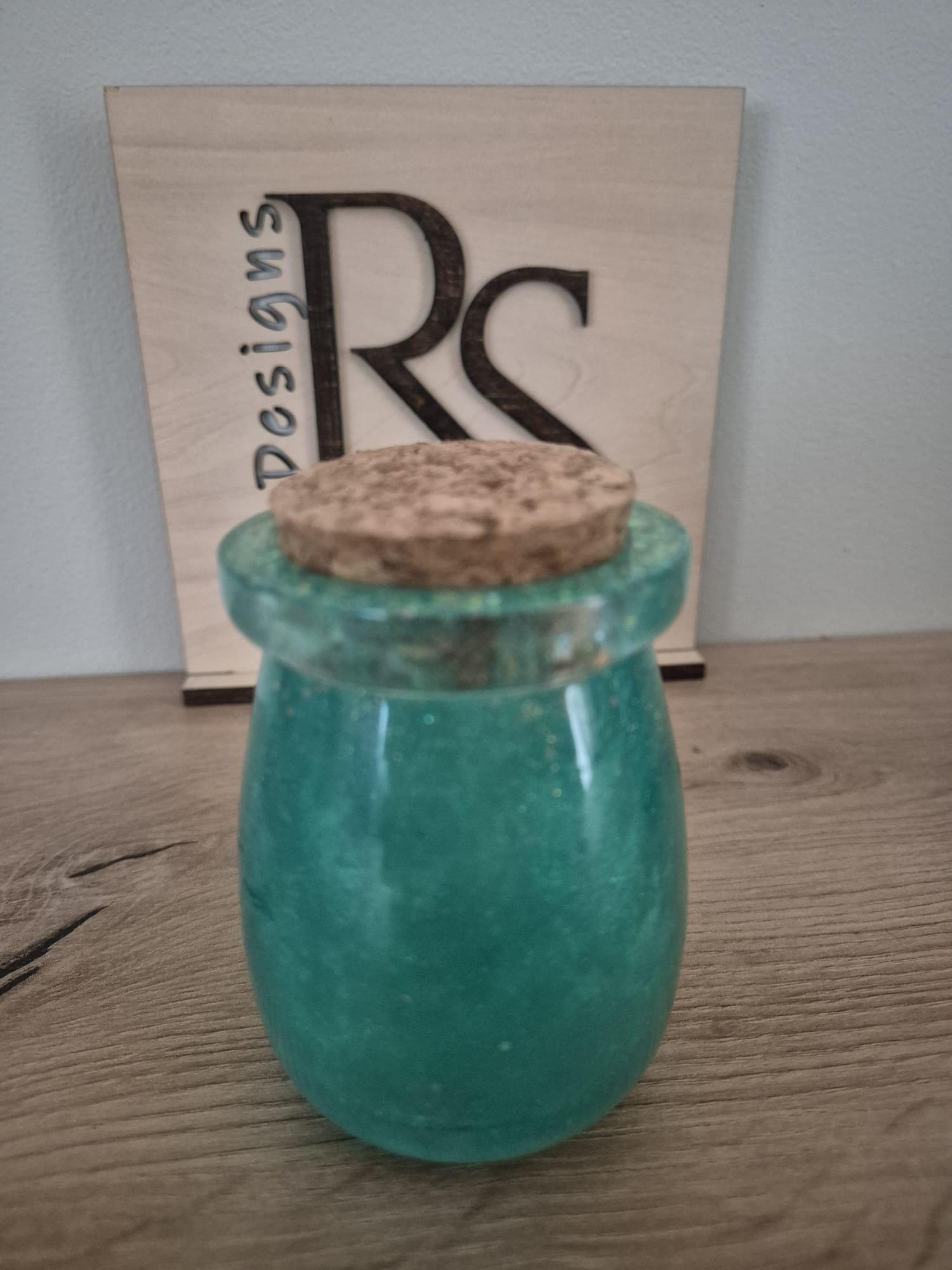 Handmade by RS Designs, this resin storage jar combines functionality with artistic craftsmanship. Each piece features a natural cork lid and arrives with the distinctive character of artisanal creation—subtle ripples and air bubbles that speak to its handmade origins rather than detract from its appeal. Perfect for organising jewellery, small treasures, or everyday essentials, this versatile container works equally well as a standalone accent or grouped with complementary pieces. The compact dimensions (approximately 6cm diameter, 9cm height) make it ideal for shelves, dressing tables, or desk spaces where you need both storage and visual interest. Crafted from quality resin with meticulous attention to detail, the jar's unique aesthetic adds warmth and personality to any interior scheme. Whether you're seeking a practical storage solution or a thoughtful gift for someone who appreciates handmade design, this piece delivers both substance and style.